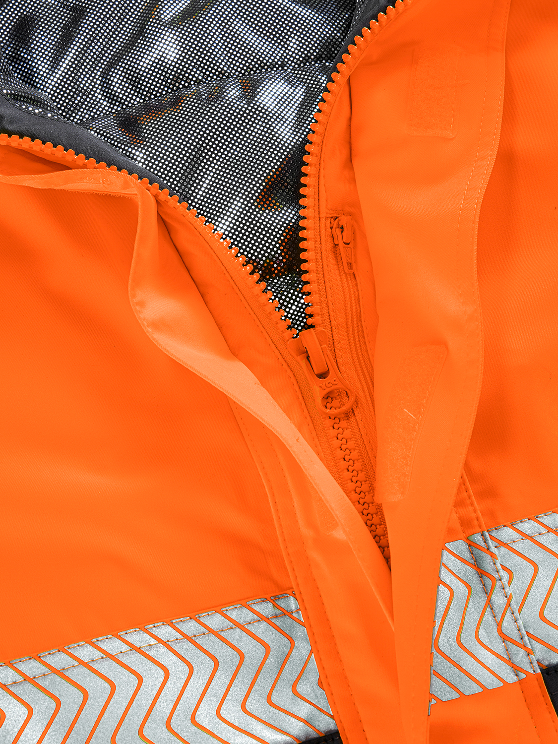 Segmentierte, auflaminierte Reflexstreifen, umlaufend um Körper und Ärmel sowie über die Schulterpartien (Hosenträgerreflexstreifen).