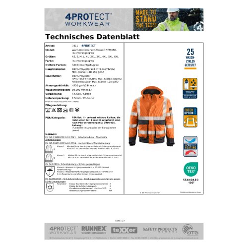 | Normen: | EN ISO 13688:2013 + A1:2021, EN 14058:2017, EN ISO 20471:2013+A1:2016, EN 343:2019 |