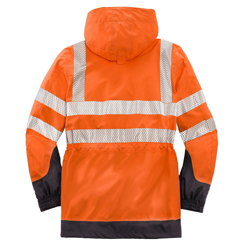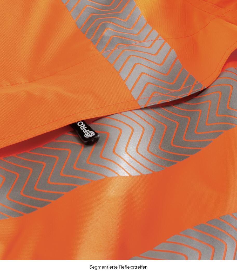 Wind- und wasserdichte Ausstattung bei hoher Atmungsaktivität, die eine lange Tragedauer gestattet. Segmentierte, auflaminierte Reflexstreifen, umlaufend um Körper und Ärmel sowie über die Schulterpartien (Hosenträgerreflexstreifen). Dunkel abgesetzter Saum- und Manschettenbereich verhindert leichtes Anschmutzen. Weitenverstellung in Taille und Saum, doppelt abgedeckter Front-Reißverschluss, bandverschweißte Nähte, abzippbare Sturmkapuze mit diversen Verstelloptionen.