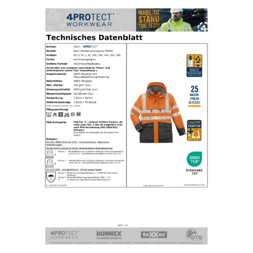 | Normen: | EN ISO 13688:2013 + A1:2021, EN ISO 20471:2013+A1:2016, EN 343:2019 |