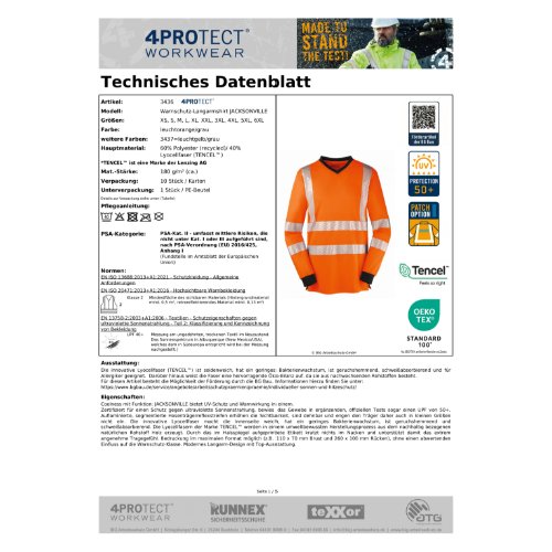 | Normen: | EN ISO 13688:2013 + A1:2021, EN 13758-2:2003+A1:2006, EN ISO 20471:2013+A1:2016 |