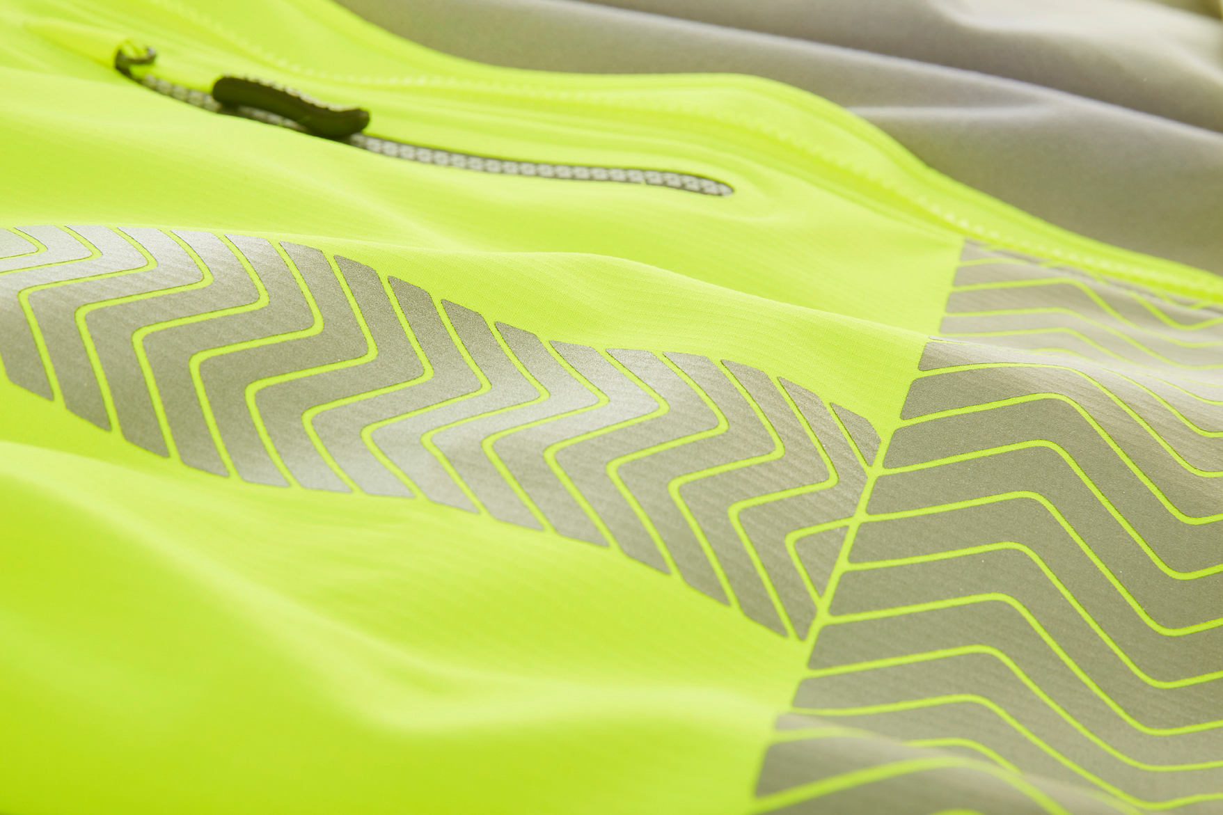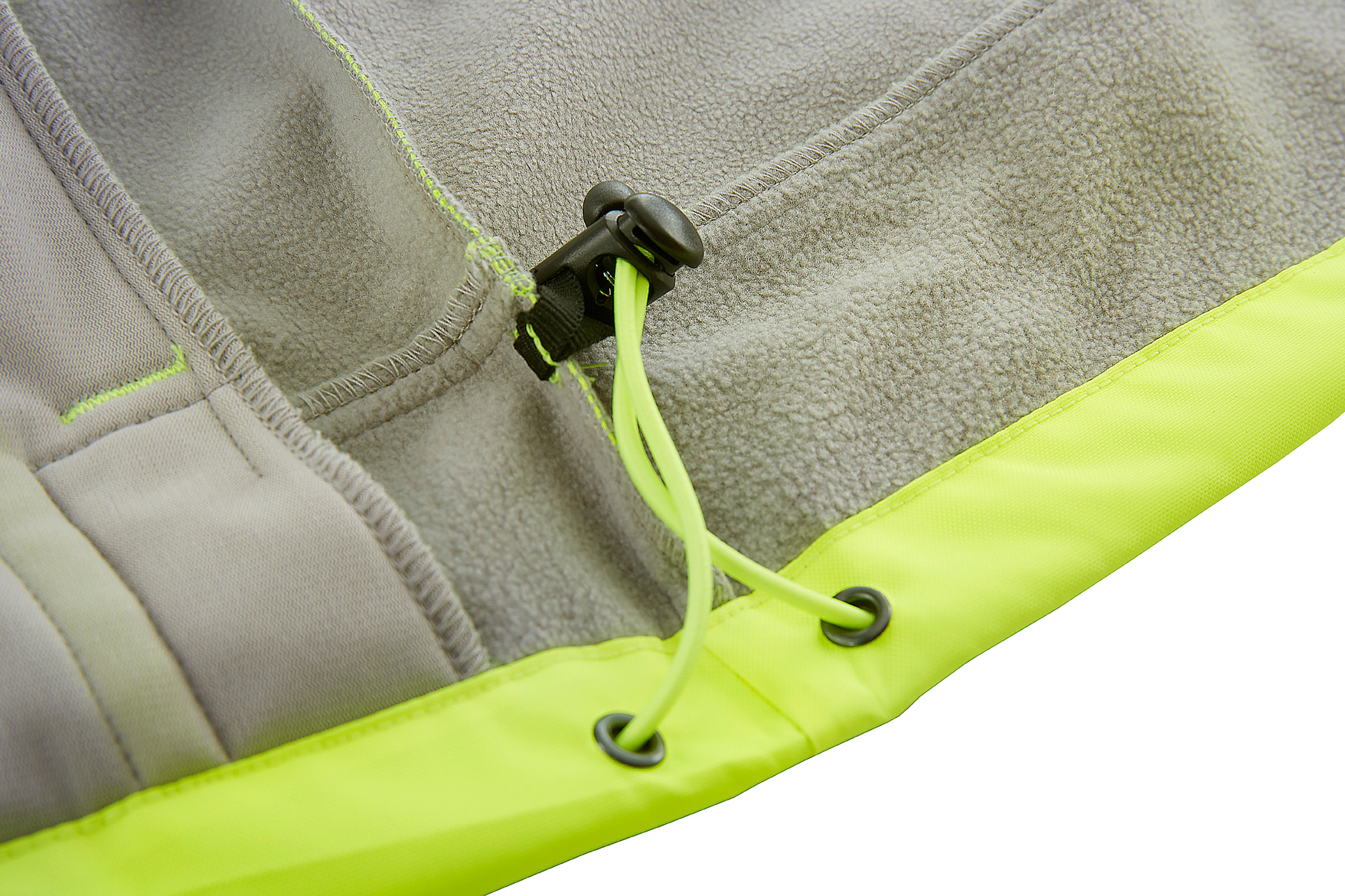 Trageangenehmes elastisches Gewebe mit körpernaher Schnittform. Reflexstreifen (ca. 5 cm breit) umlaufend um Körper und Schultern. Die eingearbeitete Klimamembrane sorgt für die die Abgabe von Feuchtigkeit nach außen. Die wärmende Fleeceinnenseite schützt den Körper vor Auskühlung. Das Ripstop-Gewebe ist besonders reißfest und verhindert bei kleineren Rissen ein Weiterreißen. Besätze am Saum aus abriebfestem Oxford-Gewebe verhindern das Abstoßen der Saumkante.