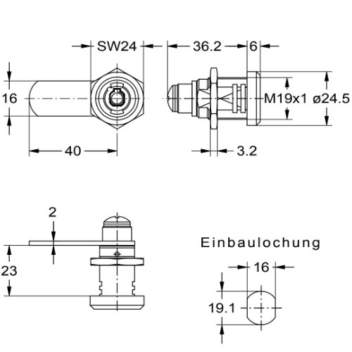 8570 FURORE Hebelschloss, mitAußengewinde M19x1,Befestigung durch Mutter,Schließweg 1-8, Metall vernickelt, für 1-12 mmMaterialstärke, ohne Schließeinsatz