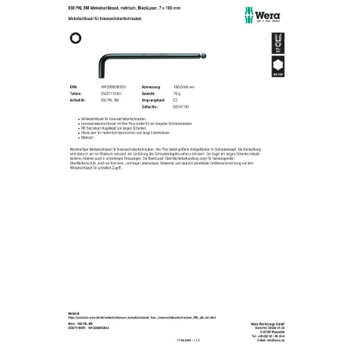 Produktinformationen "Wera 950 PKL BM Winkelschlüssel, metrisch, BlackLaser, 7 x 190 mm"