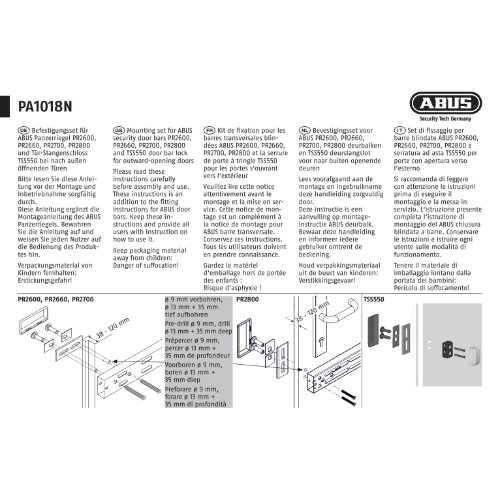 DEZENT UND SICHER ABUS Panzerriegel und Türstangenschlösser befestigen Sie mit diesem Set stabil und sicher an Ihren Türen. Sie wollen Ihre nach außen öffnenden Türen mit einem Panzerriegel oder Türstangenschloss sichern? Dann benötigen Sie eine Befestigung, die stabil verankert ist. Das Befestigungsset PA1018 ist widerstandsfähig, überzeugt aber auch durch seine Optik. Die beiden Verankerungen lassen sich sowohl auf Türen bis zu einer Stärke von 120 Millimeter, als auch im Rahmen montieren. Die gehärteten Außenteile mit eleganter Kunststoffabdeckung gibt es in Farben Schwarz und Weiß. Geeignete Panzerriegel sind PR2600, PR2660, PR2700 und PR2800 sowie das Türstangenschloss TSS550