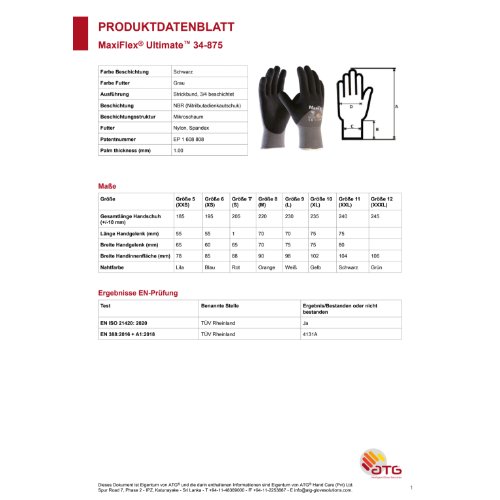 MaxiFlex® Ultimate™ ist ein Montagehandschuh, der für trockene Umgebungen entwickelt wurde, die präzises Arbeiten erfordern. • DURAtech® Technologie für extrem hohe Abriebfestigkeit von über 18.000 Zyklen. • AIRtech® Technologie für maximale Atmungsaktivität. • Optimierter Griff durch patentierte Nitril-MikroSchaumbeschichtung. • ERGOtech® für höchsten Tragekomfort. • MaxiFlex® Ultimate™ 34-875 sind für den Kontakt mit Lebensmitteln geeignet nach LFGB und stimmt mit der FDA CFR 21 Teil 177 überein - trockene, nicht fettende Lebensmittel. • Beschichtung: 3/4 getaucht. • Waschbar bis 60° • Touchscreenfähig Material: Trägermaterial: Nylon, Spandex Beschichtung: patentierter Nitril-Mikroschaum Pat. EP 1608808 (NBR = Nitrile Butadiene Rubber), ¾ beschichtet, silikonfrei Einsatzgebiete: Präzises Arbeiten unter trockenen Bedingungen, z.B. Bau, Straßenbau, Behörden/Organisationen, Druckindustrie, Entsorgungsbetriebe, Fahrzeugbau, Flugzeugbau, Forst-/Garten-/Agrarwirtschaft, Gartenbau, Gießereitechnik, Handwerk, Klimatechnik, Maschinenbau, Metallverarbeitende Industrie, Nahrungsmittelindustrie