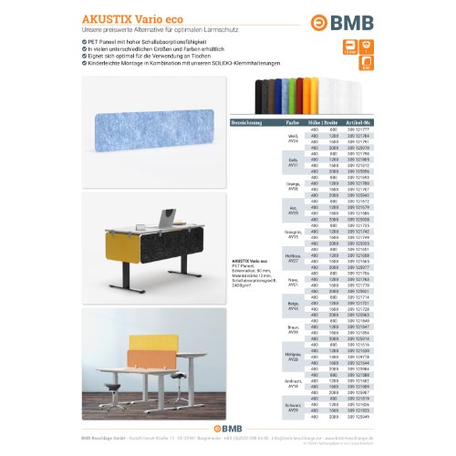 Die AKUSTIX Vario eco lassen sich genauso flexibel einsetzen, wie die normale Vario-Linie. Wenn vorrangig Blickschutz wichtiger als Schallschutz ist, bieten sich die eco-Varianten von AKUSTIX an. Das Material ist nur 12 mm dick, mit 2400 g / m² aber sehr robust. Zudem bietet das Vario eco Sortiment eine Vielzahl von Farben, wodurch sich die Elemente optimal in viele Innengestaltungen einpassen können. Unsere AKUSTIX Lärmschutz-Elemente sorgen für eine Verringerung der Nachhallzeit, was für eine erhebliche Verbesserung der Raumakustik sorgt. Sie absorbieren über 80% der hörbaren Schallwellen. Das clevere Konzept aus verschiedenen AKUSTIX Elementen kann jede Arbeitssituation optisch und akustisch spürbar verbessern. Die Schallwellen werden effizient von beiden Seiten absorbiert. Menschen werden also nicht nur vor äußeren Geräuschquellen geschützt, sondern schützem auch ihre Mitmenschen vor eigenverursachtem Lärm - Die akustischen Signale verlassen nur stark gedämpft den Raum. Die AKUSTIX Elemente bieten ebenfalls einen attraktiven Sicht- und Blickschutz. Die Einsatz- und Gestaltungsmöglichkeiten sind praktisch unendlich. Große Flächen lassen sich einfach strukturieren, auf kleinen Flächen wird platzsparend eine beruhigte Akustik ermöglicht. Auch komplizierte Umgebungen lassen sich mit unserer AKUSTIX Serie mühelos ausstatten. Zusätzlich sind alle AKUSTIX Module Umwelt- und ressourcenschonend, da sie aus 100% recyceltem PET hergestellt wurden und auch selbst zu 100% recycelbar sind. Anwendungsbeispiele: Besprechungsräume, Konferenzräume, Verwaltungen, Call-Center, Kanzleien, Praxen, Wartebereiche, Ruhebereiche, Sportstätten, Schulen, Kindergärten, Gastronomie wie Kantinen, Bars, Tonstudios, Theater, Kino, Sitzungssäle und nicht zuletzt der private Wohnbereich oder auch das Heimkino.