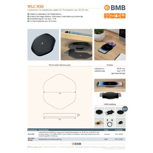 BMB WLC H30, 10 W, Ø112 mm, Schwarz, Ladestation für kabelloses Laden, Tischplattenstärke 10-30 mm, Kabel: 1,5 m, Quick Charge 3.0 Adapter, Halterung, Induktionssticker, Ausrichtungshilfe, Anleitung.