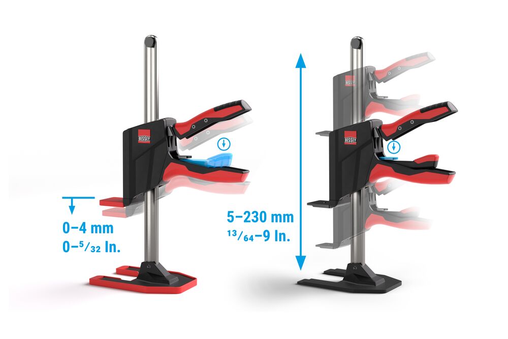 Zum millimetergenauen, sanften und sicheren Anheben (bis zu 8 mm pro Betätigung des Pumpgriffs), Absenken (bis zu 4 mm pro Betätigung des Absenkhebels) sowie Ausrichten von Werkstücken mit nur einer Hand
