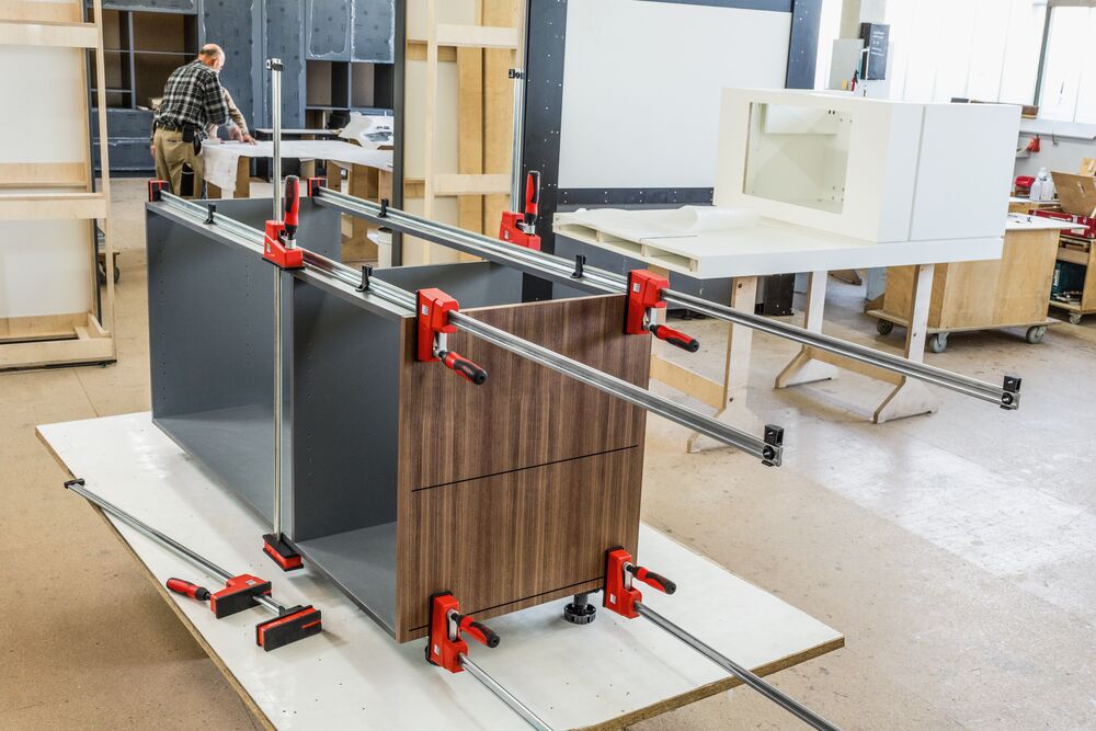 Die großen, exakt parallel geführten Spannflächen sind typisch für die Original BESSEY Korpuszwinge REVO und die leichte Korpuszwinge UniKlamp. Damit lassen sich empfindliche Oberflächen sowie rechte Winkel problemlos spannen und spreizen. Runde und spitze Werkstücke übrigens ebenso. Und das Beste: Dank der extra großen Auflageflächen ist sowohl die Original BESSEY Korpuszwinge REVO als auch die UniKlamp universell einsetzbar – selbst hinter und seitlich der hochwertigen Hohlprofilschiene. Dadurch werden sogar Spannstellen zugänglich, die Sie mit üblichen Schraubzwingen nicht erreichen.