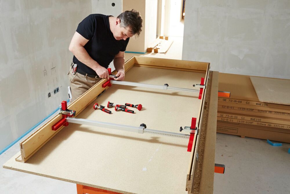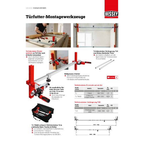 Die moderne Technik der Türfutter- und Fenstermontage mittels Montageschaum erfordert Spezialwerkzeuge, die ein exaktes Ausrichten und Abstützen ermöglichen. BESSEY bietet für diesen Einsatzzweck optimierte Hilfsmittel und ein perfekt aufeinander abgestimmtes Montagesystem. So ermöglicht beispielsweise die Türfutterstebe TU in Kombination mit der Verlängerung TUX auch den Einbau überbreiter Türen, wie es barrierefreies Bauen erfordert. Im Mauerdurchbruch fixierte Futter können mit Hilfe der Türfutter-Richtzwinge TFM schonend verschoben werden – das Verdrücken der Zierfutternut oder das Beschädigen fertig tapezierter Wände wird vermieden. Darüber hinaus können Türfutter mit der Winkel-Türfutter-Richtzwinge WTR horizontal und vertikal exakt im 90° Winkel gehalten und ausgerichtet werden.
