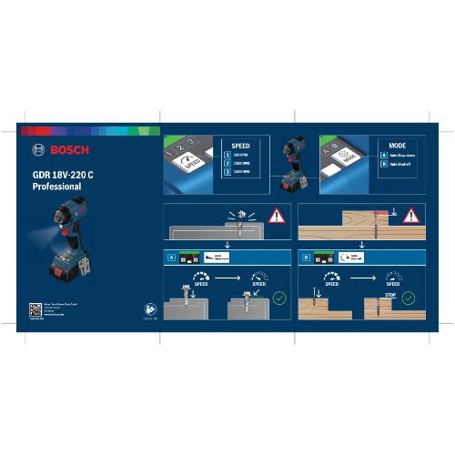 Akku-Drehschlagschrauber GDR 18V-220 C, Leichtgängiges Einschrauben von Schrauben in Holz und Blech erfordert ein Werkzeug, das Leistung mit Kontrolle kombiniert. Der GDR 18V-220 C Professional mit ¼"-Innensechskantaufnahme ist ein durchzugsstarker, kompakter Drehschlagschrauber mit Zusatzfunktionen. Mit einer Kopflänge von 113 mm ist er leichter zu handhaben, besonders bei Arbeiten an engen Stellen. Dank leistungsstarkem, bürstenlosem Motor mit bis zu 3.400 min⁻¹, drei Drehzahlstufen und einem hohen Drehmoment von 220 Nm, lässt sich die Arbeit schneller und kontrollierter erledigen. Die Einstellmöglichkeit des Schraubmodus sorgt für eine kontrollierte Anwendung, indem der Drehschlagschrauber langsamer wird (A) oder abschaltet (B), um gebrochene Schraubenköpfe und beschädigte Werkstücke zu vermeiden. Weitere Betriebsarten stehen über die Bosch Toolbox App zur Verfügung und sind dort individuell einstellbar. Bits können einhändig eingesteckt werden – einfach auf das Bit drücken und es rastet ein. Das Doppelkugellager sorgt für einen festen Halt des Bits und höhere Präzision. Die zwei LED-Lichter, eins am Kopf und eins am Fuß des Schraubers, liefern eine erstklassige Beleuchtung des Arbeitsplatzes. Ganz im Sinne der Profi-Handwerker verfügt das Werkzeug über ein Vollmetallgetriebegehäuse. Das Werkzeug ist mit Statusanzeige und Gürtelclip ausgestattet. Es ist kompatibel mit dem Bosch Professional 18V System und mit der markenübergreifenden AMPShare Akku-Allianz. Kraftvoller und kompakter Drehschlagschrauber für Spitzenergebnisse bei SHK-Projekten, Elektroarbeiten oder Schreinerarbeiten. 1 x Bluetooth Low Energy Modul GCY 42 Professional (1 600 A01 6NH). 1 x Gürtelclip, 1 x Bithalter. L-BOXX-Volleinlage für die Werkzeugaufbewahrung (1 600 A03 2H0). L-BOXX 136 (1 600 A01 2G0)
