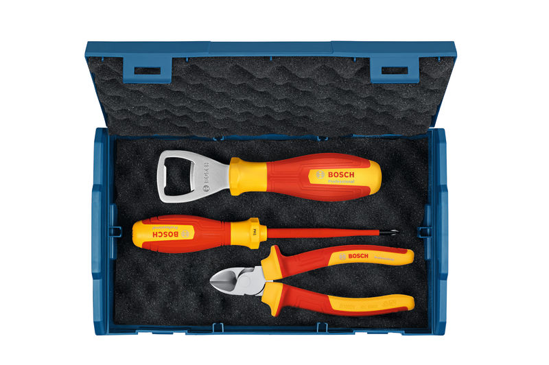 Das limitierte Bosch Professional VDE-Werkzeugset (1600A035DG) ist das ideale Geschenk für Elektriker und Fachhandwerker. Das Set enthält drei speziell isolierte Werkzeuge, die nach DIN EN/IEC 60900 für Arbeiten unter Hochspannung zertifiziert sind: