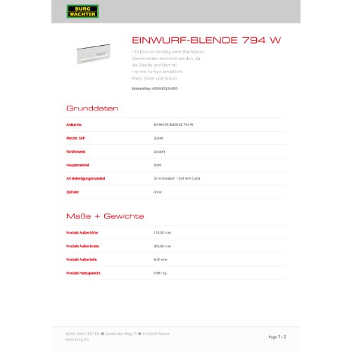 Eigenschaften "Burg-W Einwurfblende für 795 Blende 794 W"
