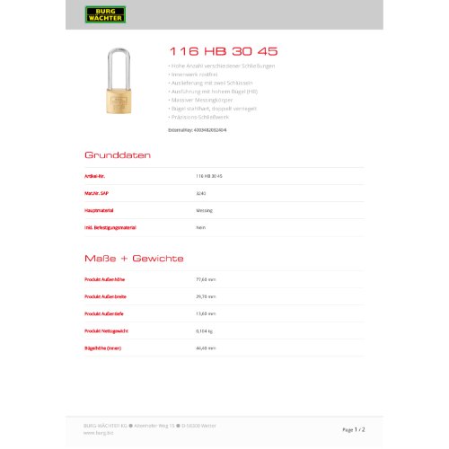 Eigenschaften "Burg-W Hangschloss 116 HB 30 45"