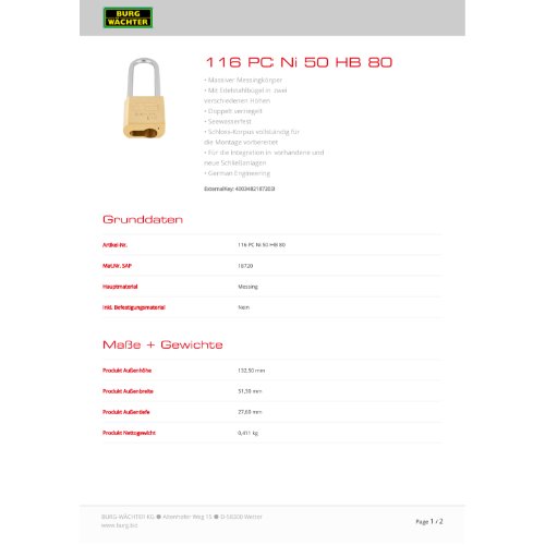 | Variante: | Burg-W Hangschloss 116 PC 50 HB 80 Niro |