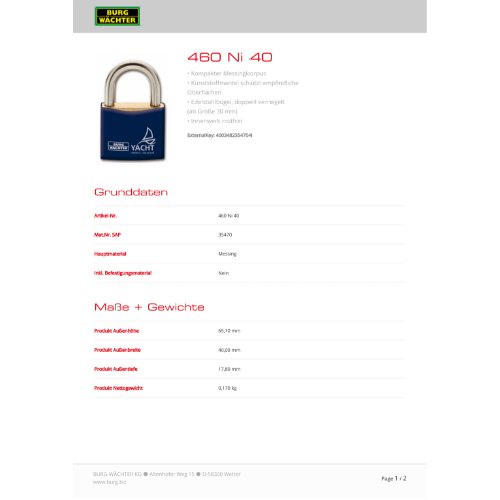 Eigenschaften "Burg-W Hangschloss 460 Ni 40"