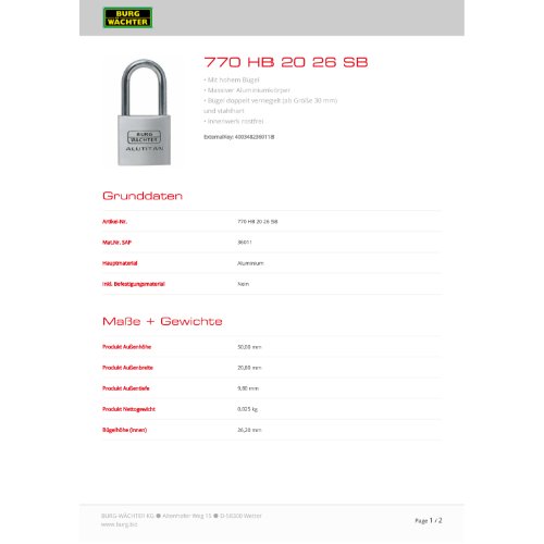 Variante: | Burg-W Hangschloss 770 HB 20 26 SB |