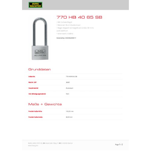 | Variante: | Burg-W Hangschloss 770 HB 40 65 SB |