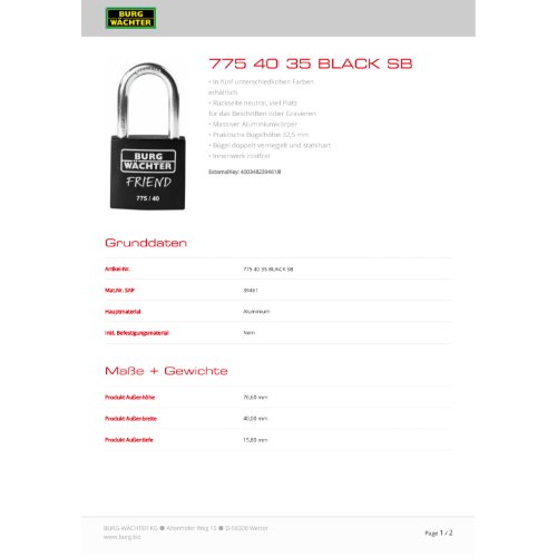 | Variante: | Burg-W Hangschloss 775 40 35 BLACK SB |