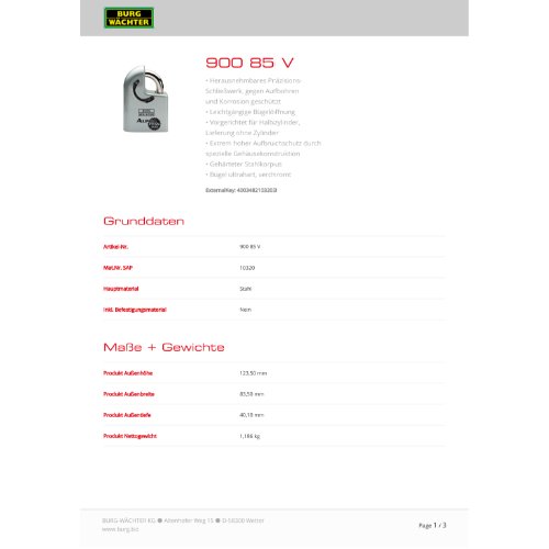 Eigenschaften "Burg-W Hangschloss Alpha Titan 900 85 V"