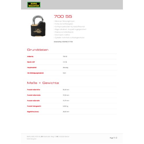 Eigenschaften "Burg-W Hangschloss Gamma 700 55"