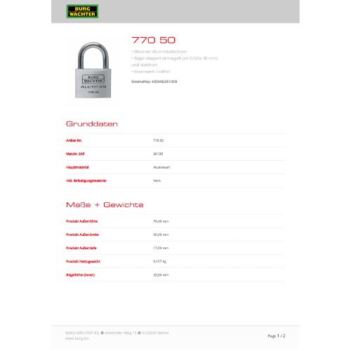 Eigenschaften "Burg-W Hangschloss aus Aluminium 770 50 Alutitan"