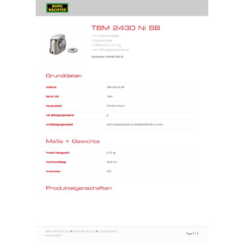 Eigenschaften "Burg-W Magnet-Türstopper TBM 2430 Ni SB"