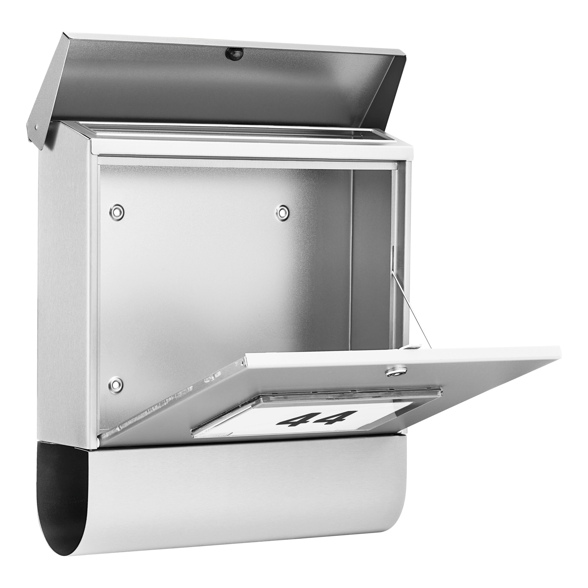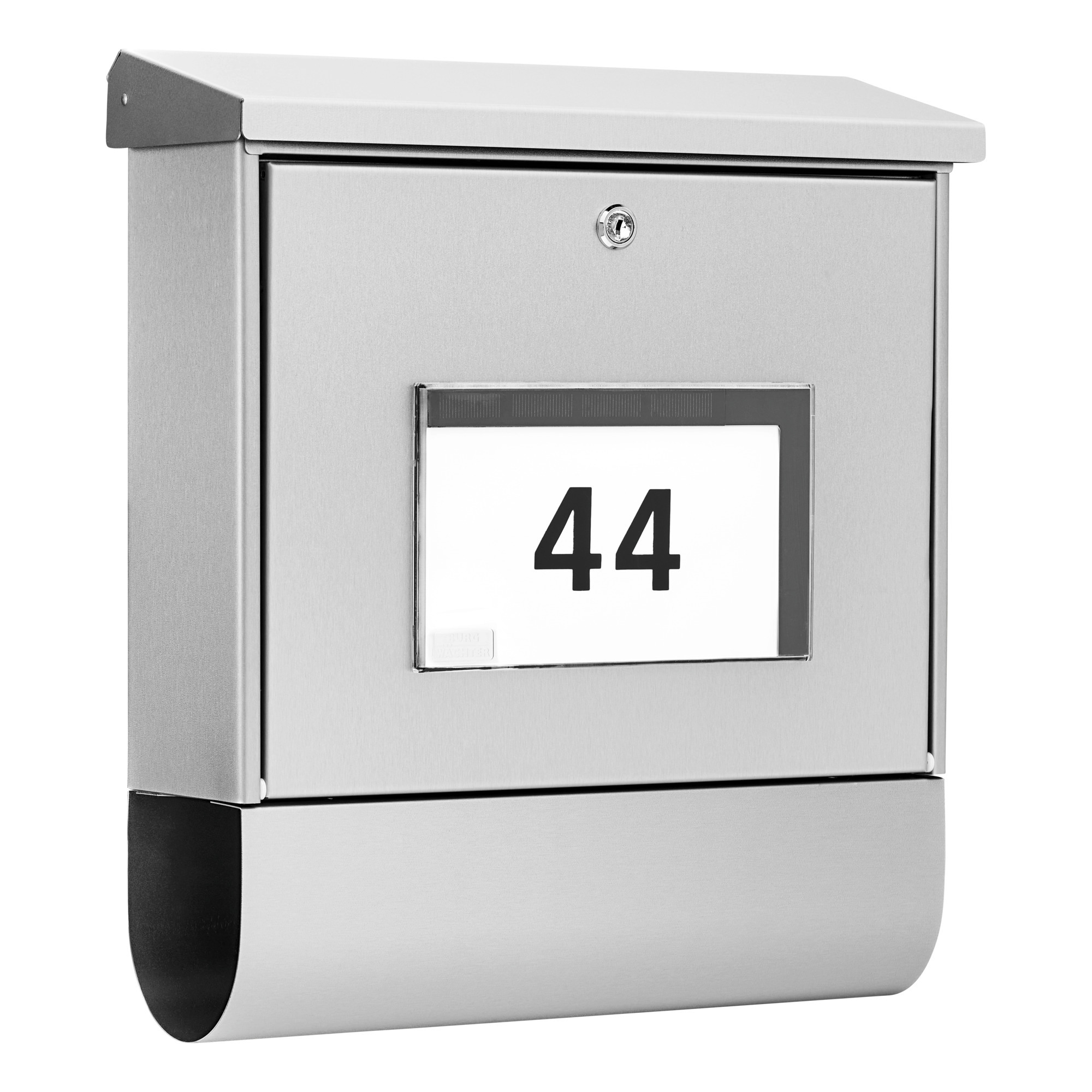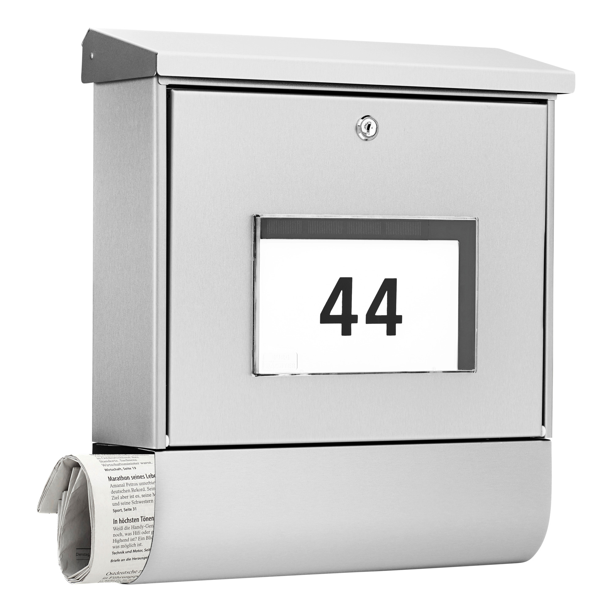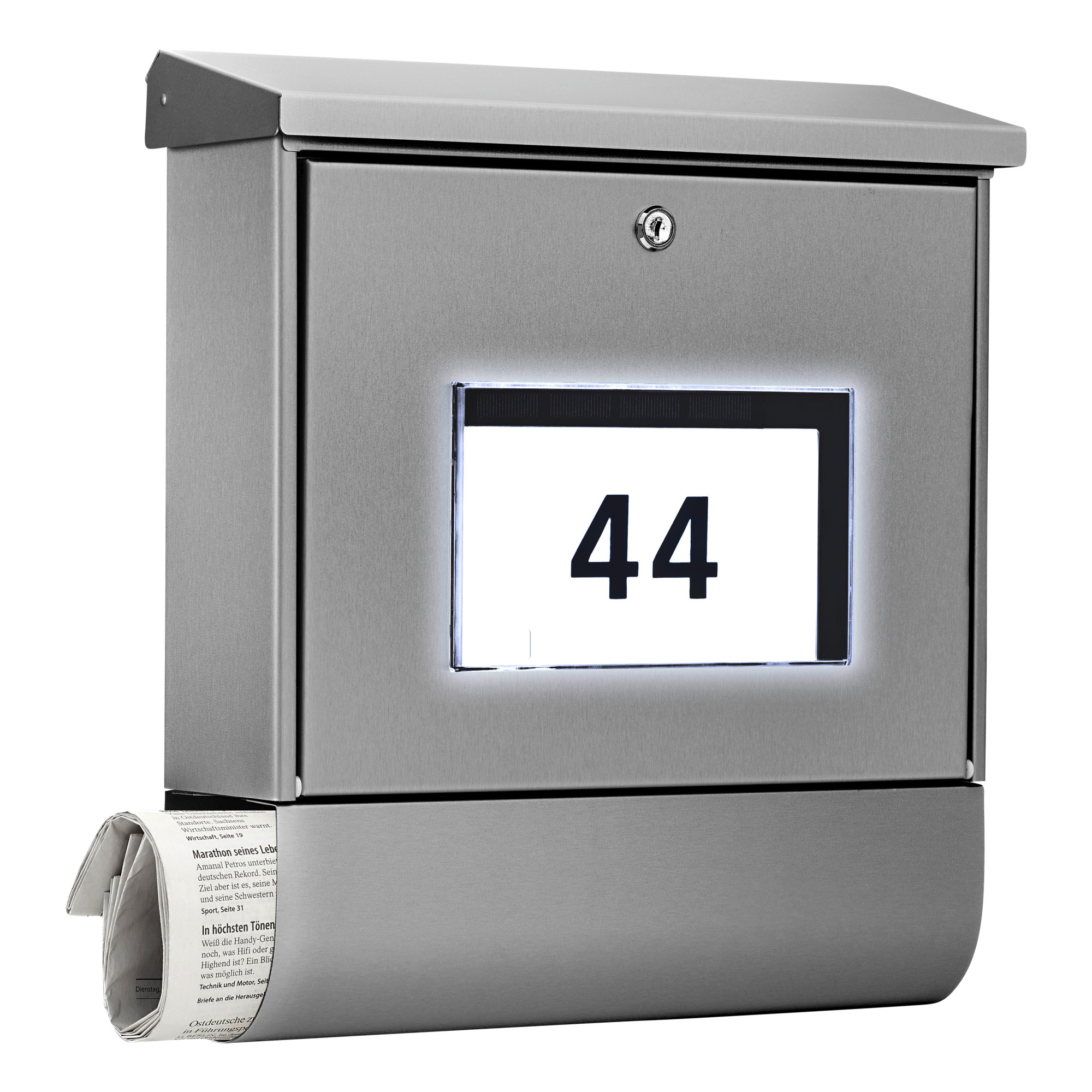 Vollflächig verzinkt, hochwertig beschichtetIn zwei Farben erhältlich: Weiß und SilberAusgestattet mit Solarpanel mit Dämmerungssensor zur LED-Beleuchtung der Hausnummer, inkl. selbstklebender HausnummerMade in GermanySehr hohe KorrosionsbeständigkeitSchutz bei Diebstahlund AufbruchsicherheitMit ÖffnungsstoppLieferung mit zwei SchlüsselnGeprüft nach Norm EN 13724Mit integrierter ZeitungsboxEinwurf DIN C4