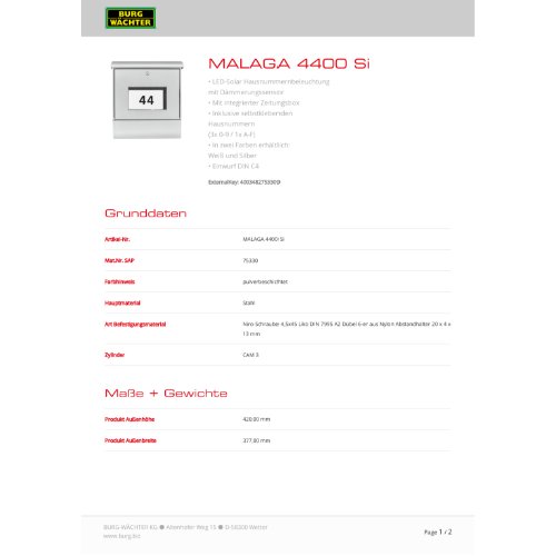 Eigenschaften "Burg-W Solar-Briefkasten-Set Malaga 4400 silber"