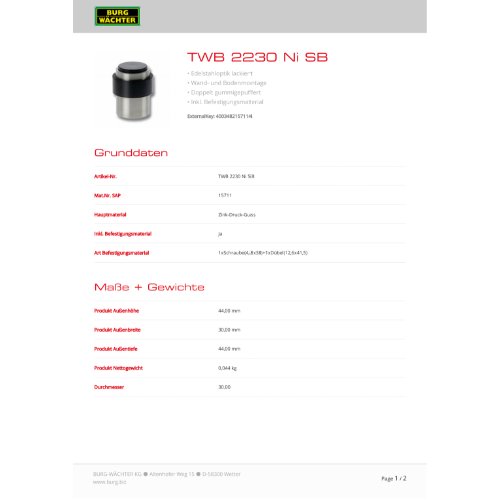 Eigenschaften "Burg-W Türpuffer Wand- + Bodenmontage TWB 2230 Ni SB Edelstahloptik"