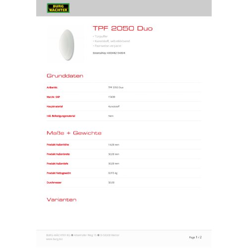Eigenschaften "Burg-W Türpuffer selbstklebend TPF 2050 Duo (1 Paar) weiß Ø 50 mm, Höhe 14 mm"