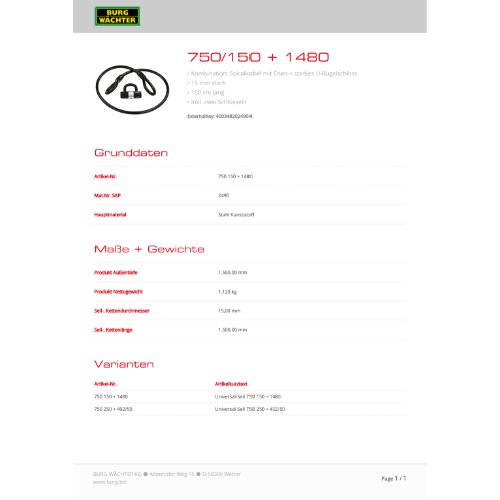 Eigenschaften "Burg-W Universalseil 1,5 mtr. mit U-Bügelschloss 750 150 + 1480"