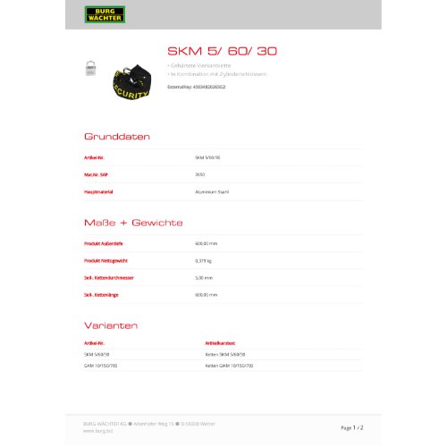 Eigenschaften "Burg-W Vierkantkette mit Schloss SKM 5/60/30"