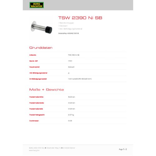 Eigenschaften "Burg-W Wandtürpuffer 90 mm TSW 2390 Ni SB Edelstahl"