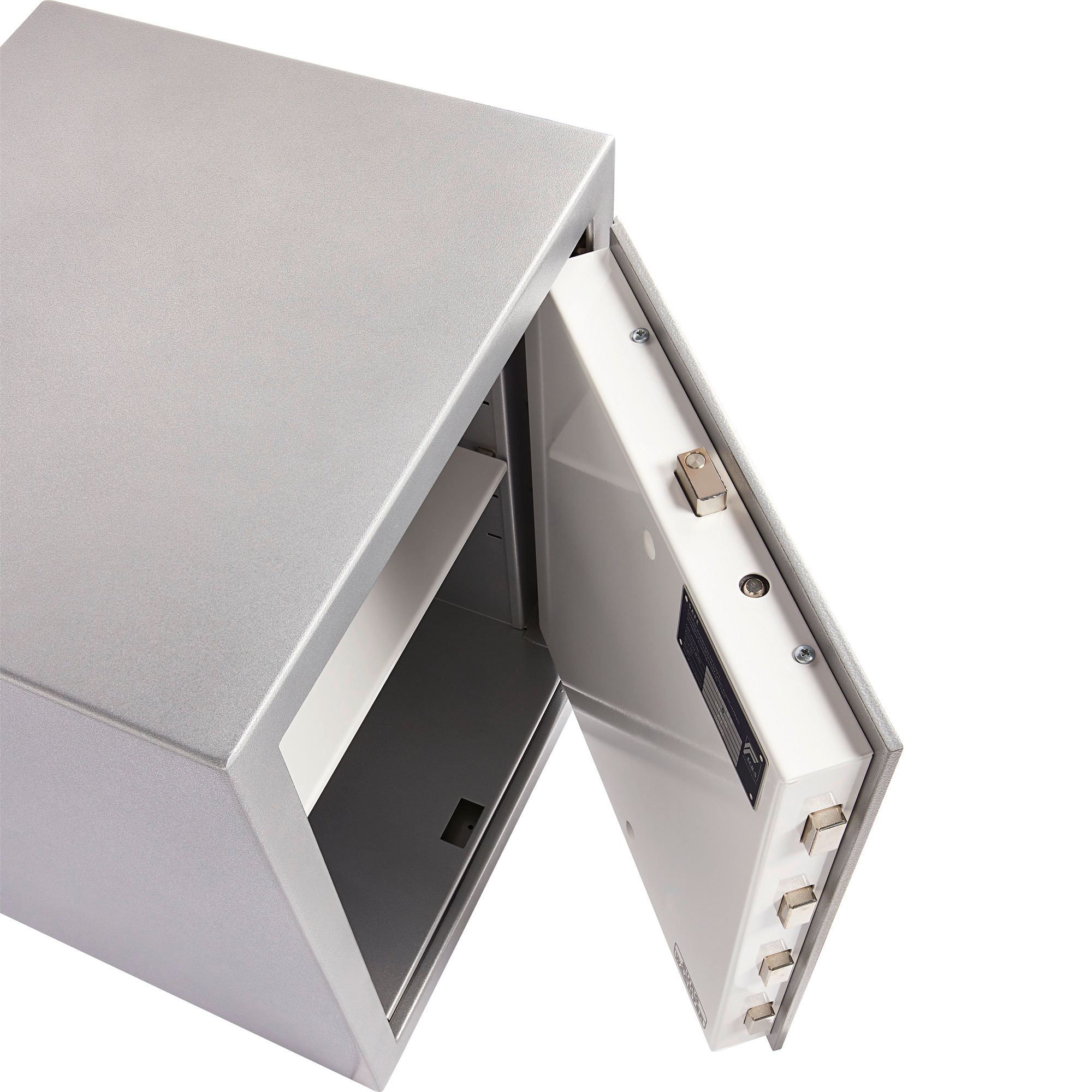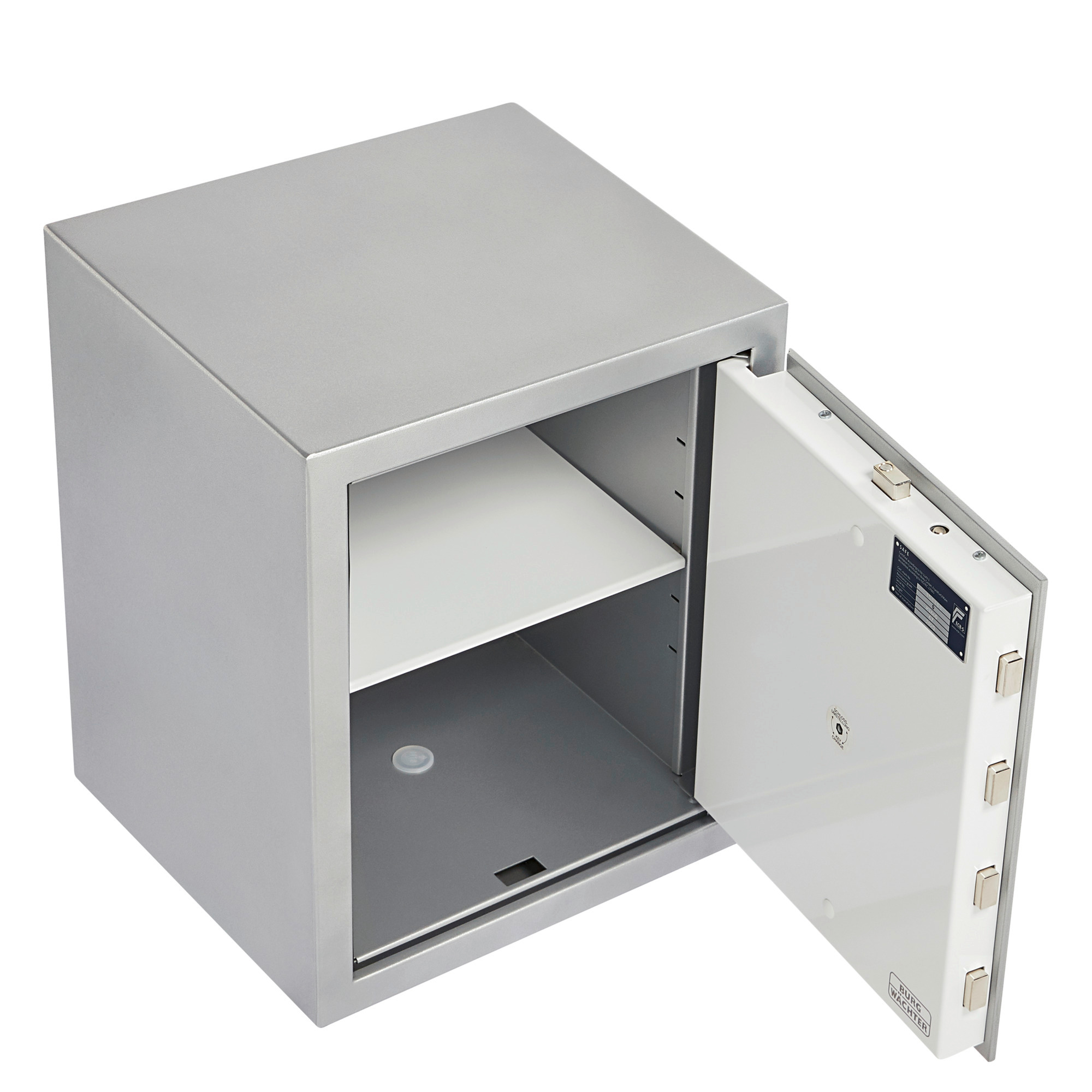 Typgeprüfte und vom ECB·S überwachte Sicherheit Feuergeschützt, zertifizierter Einbruchschutz nach EN 1143-1 Korpus 3-wandig, Außenmantel aus brennschneidgeschütztem Edelstahl Tür doppelwandig mit zusätzlichen Armierungen, Türplatte: 7 mm SM-Stahl Mit Schlossschutzpanzerung 3-seitige Verriegelung durch starke Vierkantbolzen, Riegelbolzen oben und unten mit integrierter Stahlrolle – extremer Zusatzschutz gegen Brennschneiden, Aufbohren und Durchschlagen Durchgehende Hintergreifschiene an der Bandseite Vorgerichtet für Rückwandund Bodenverankerung, mit Befestigungsmaterial – extrem hoher Ausreißwiderstand. Je eine Rückwandund Bodenbohrung, mittig angeordnet Feuerschutzmaterial nach DIN 4102-A1, Korpus mit umlaufendem Feuerfalz Ordnertiefe, ein verstellbarer Fachboden Lackierung: Platingrau Sicherheitsplus: Thermisches Notverriegelungssystem, SpezialDurchschlagsicherung vor jedem RiegelbolzenAusführung E FP SecuTronic