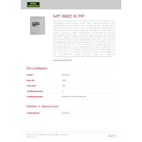 Eigenschaften "Burg-W Wertschutzschrank Karat mit elektronischem Schloss MT 660 E FP"