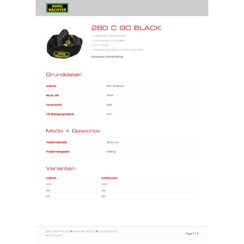 Eigenschaften "Burg-W Zahlen-Kettenschloss Ø 6 mm 280 C 90 BLACK"