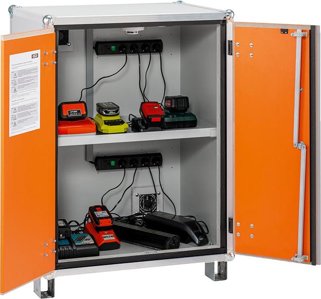 Dieser Akku-Ladeschrank verfügt über wichtige Sicherheitseinrichtungen zum Laden von Lithium-Akkus.