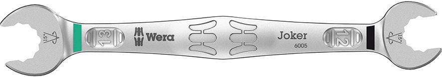 Doppel-Maulschlüssel, Nr. 6005 Joker • Nickel-Chrom-Beschichtung • Chrom-Molybdän-Stahl • Maulstellung 7,5° • Haltefunktion • Endanschlag • Doppel-6-kant-Geometrie und sehr harte Zähne für verringerte Abrutschgefahr • Rückschwenkwinkel 15°, wenn der Schlüssel zwischen den einzelnen Schraubzügen gewendet wird • Auswechselbare, gehärtete und gezahnte Metallplatte mit Haltefunktion auf den Maulseiten Hersteller: Wera Werkzeuge GmbH, Korzerter Str. 21-25, 42349 Wuppertal, DE, +4920240450, sales@wera.de