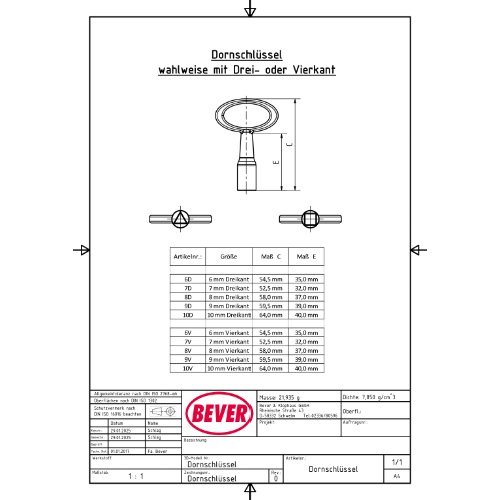 Eigenschaften "Dornschlüssel Serie V 6 mm 4-kant 6V"