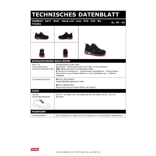 ELTEN, 742561-35, Damen-Sicherheitshalbschuh HANNAH XXTL BOA® black-red Low ESD S3S, Gr. 35, 4030839281499, 384444, Schwarz,Rot, EN ISO 20345:2022 S3S FO/SR, Form A, S3S, Atmungsaktives Textilfutter, Hydrophobierte Mikrofaser/Hydrophobiertes Textilmaterial, Stahlkappe, Metallfreier Durchtrittschutz