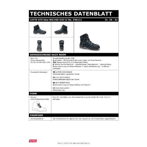 Eigenschaften "ELTEN Damen-Sicherheitsschnürstiefel LOTTE GTX blue Mid ESD S3S CI, Gr. 42"