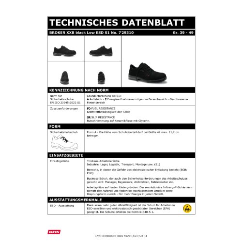 Eigenschaften "ELTEN Sicherheitshalbschuh BROKER XXB black Low ESD S1, Gr. 49"