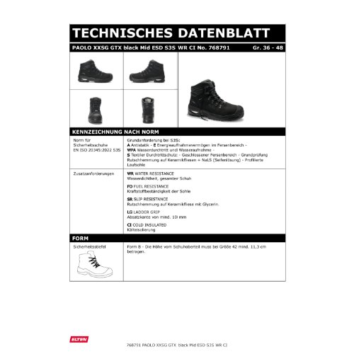 | Norm: | EN ISO 20345:2022 S3S WR/FO/SR/LG/CI, Form B |