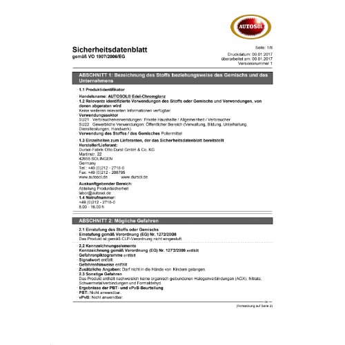 Hersteller: Dursol Fabrik Otto Durst GmbH & Co. KG, Martinstrasse 22, 42655 Solingen, DE, +49 212 2718-0, info@autosol.de