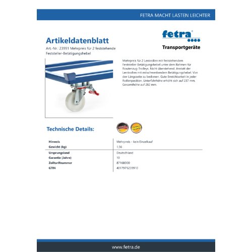 Mehrpreis für 2 Lenkrollen mit feststehendem Feststeller-Betätigungshebel unter dem Rahmen für Routenzug-Trolleys. Nicht überstehend. Anstatt der Lenkrollen mit mitschwenkendem Betätigungshebel. Von der Längsseite zu bedienen. Gute Erreichbarkeit in jeder Rollenposition. Unterfahrhöhe erhöht sich auf 237 mm, Gesamthöhe auf 282 mm.