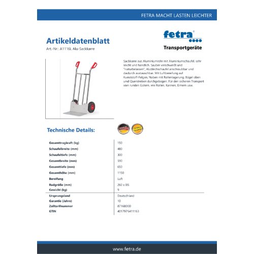 Eigenschaften "FETRA Alu-Sackkarre A1116L"