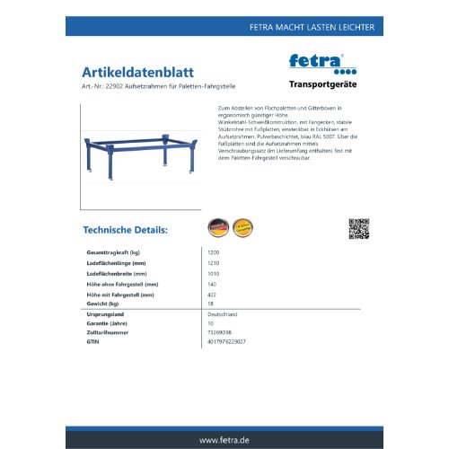 Eigenschaften "FETRA Aufsetzrahmen 22902 für Paletten-Fahrgestell"