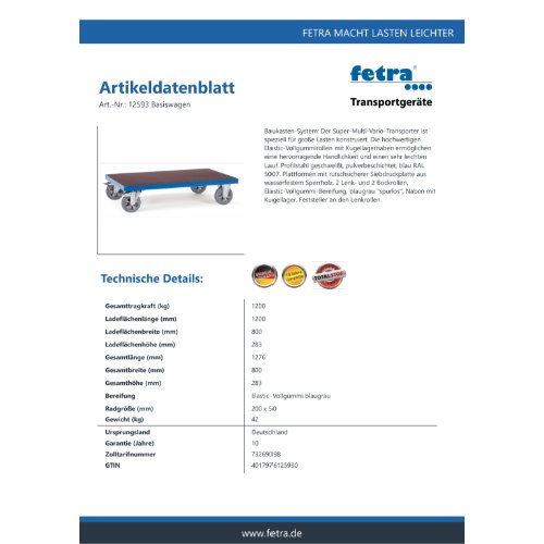 Baukasten-System: Der Super-Multi-Vario-Transporter ist speziell für große Lasten konstruiert. Die hochwertigen Elastic-Vollgummirollen mit Kugellagernaben ermöglichen eine hervorragende Handlichkeit und einen sehr leichten Lauf. Profilstahl geschweißt, pulverbeschichtet, blau RAL 5007. Plattformen mit rutschsicherer Siebdruckplatte aus wasserfestem Sperrholz. 2 Lenk- und 2 Bockrollen, Elastic-Vollgummi-Bereifung, blaugrau "spurlos", Naben mit Kugellager. Feststeller an den Lenkrollen.